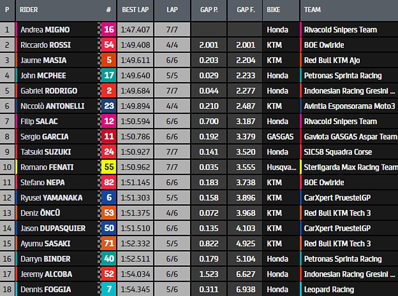 A 3min de la présentation du drapeau à damiers, Deniz Öncü (KTM, Red Bull KTM Tech3, #53) pointe en tête, en 1’51.375. Andrea Migno (Honda, Rivacold Snipers Team, #16) lui reprend la politesse en 1’50.210, en étant resté en slicks, mais il reste un tour lancé à tous les pilotes.