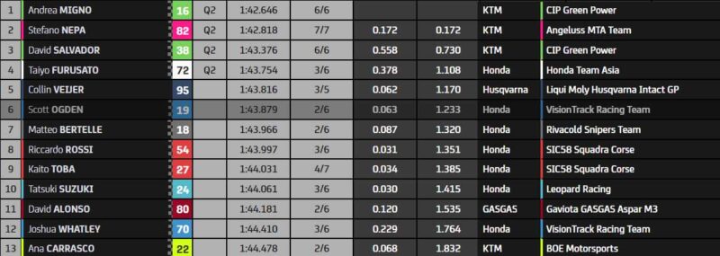 Les qualifiés sont, dans l’ordre, Andrea Migno, Stefano Nepa, David Salvador et Taiyo Furusato (Honda Team Asia). Le classement évolue en fonction des annulations de tours pour dépassement des limites de piste et les passages sous drapeau jaune. Parmi les autres infortunés, Kaito Toba (Honda Sic58 Squadra Corse) et David Alonso (GasGas Aspar Team).