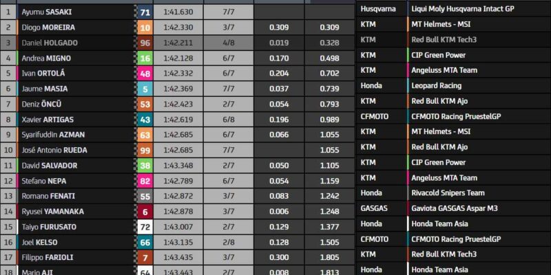 Tous sont à fond, et Ayumu Sasaki fait parler sa vitesse. Le Japonais manque même de percuter Filippo Farioli (Red Bull KTM Tech3) au Chemin aux Bœufs ! Daniel Holgado, pilote Tech3 « à la maison » est aussi dans le coup. Diogo Moreira, actuellement 3e, n’est pas loin.