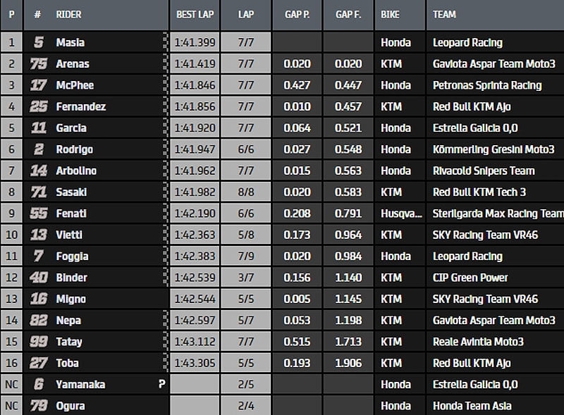 Le top5 qui s’alignera demain sur la ligne de départ est composé de : Masia, Arenas, McPhee, Garcia et Rodrigo