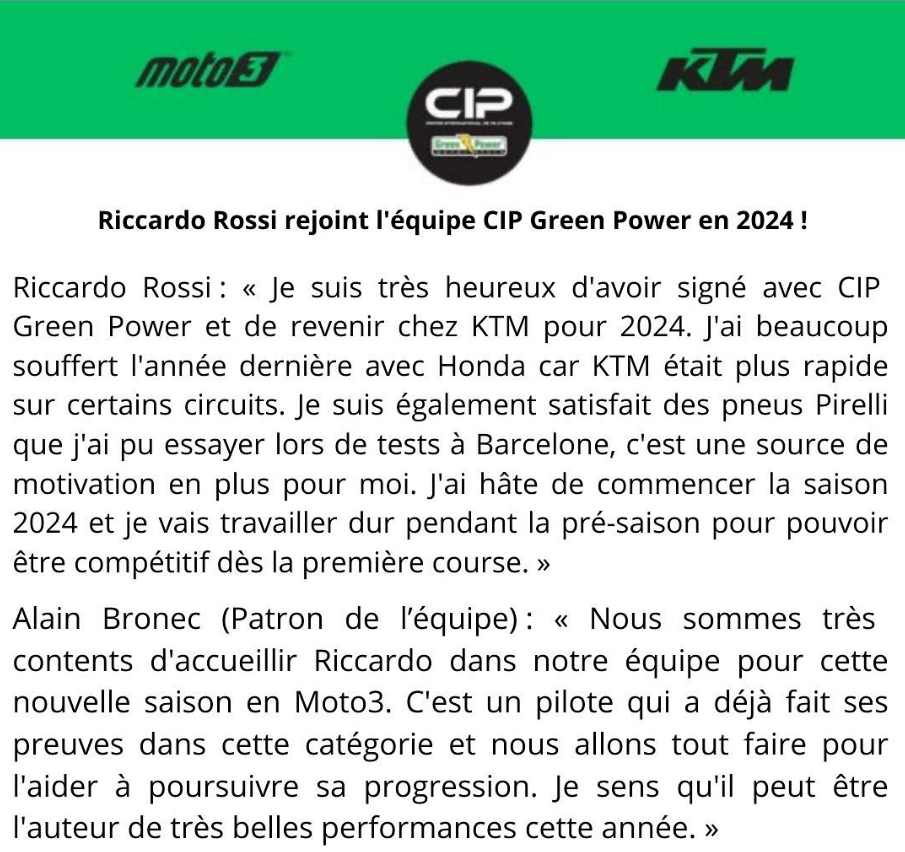 « Nous sommes très heureux d’annoncer que le pilote Riccardo Rossi a signé avec l’équipe CIP Green Power pour la saison 2024. Le jeune italien de 21 ans s’est déjà illustré à plusieurs reprises dans la catégorie Moto3 avec plusieurs podiums à son actif dont une 3ème place au Mans en 2021. » est le message que l’on peut lire sur le compte Instagram de l’équipe française, complété par les propos suivants.