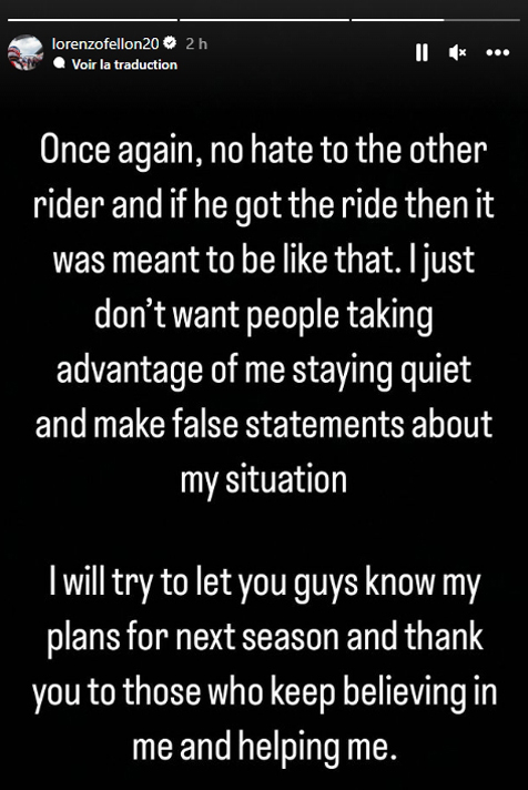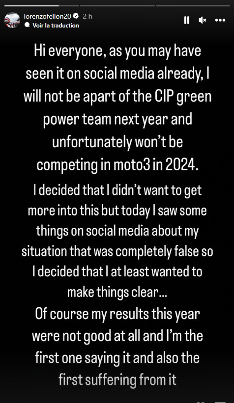 Lorenzo Fellon, issu du CIP et du Championnat du Monde Moto3, a tenu à expliquer sa situation actuelle.
