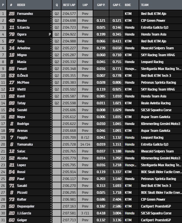 Raul Fernández (KTM, Red Bull KTM Ajo) s’empare du commandement en 2’06.051 avant que Ai Ogura (Honda, Honda Team Asia) abaisse la référence provisoire en 2’05.936.