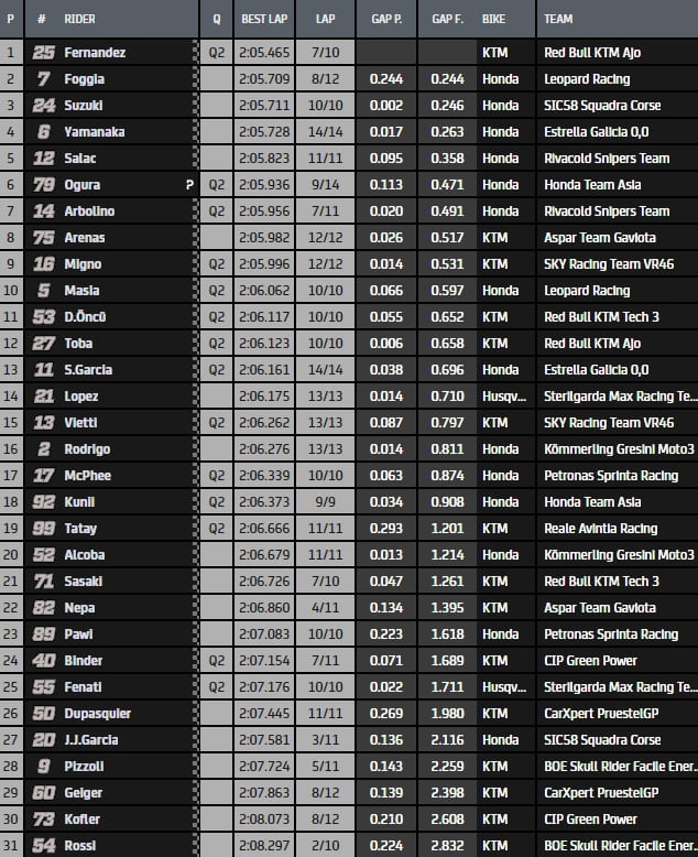 Cela permet toutefois d’observer la hiérarchie très provisoire composée de Tatsuki Suzuki (Honda, SIC58 Squadra Corse), 3 dixièmes devant Albert Arenas (KTM, Aspar Team), Dennis Foggia (Honda, Leopard Racing), Alonso López (Husqvarna, Sterilgarda Max Racing Team) et un étonnant Stefano Nepa (KTM, Aspar Team) que l’on n’a pas l’habitude de voir en si bonne posture.