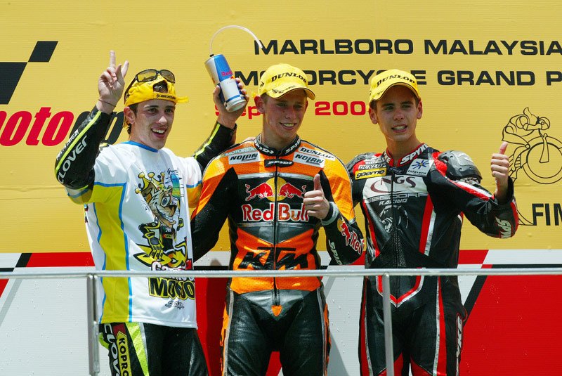 Un an après son arrivée en championnat du monde, la première victoire de KTM en Grand Prix a été obtenue par le jeune Casey Stoner le 10 octobre 2004 à Sepang, un an après l’arrivée des Autrichiens en 125cc sous la responsabilité d’Harald Bartol.