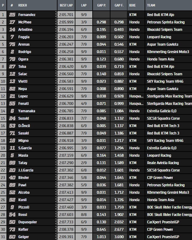 À l’issue du premier tour lancé, c’est John McPhee (Honda, Petronas Sprinta Racing) le plus prompt à se mettre en rythme, en 2’06.502, puis 2’05.999, avec uniquement Raul Fernández (KTM, Red Bull KTM Ajo) dans la même demi-seconde, malgré une prise de bec avec Dennis Foggia (Honda, Leopard Racing).