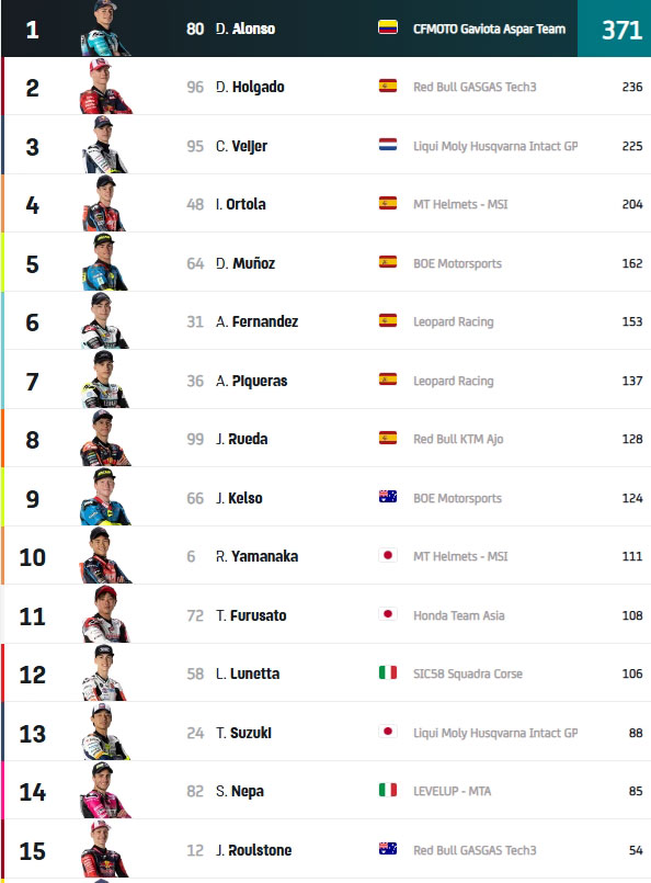 Ivan Ortola (MT Helmets – MSI), qui a pris la quatrième place à Buriram, est à 32 points de Daniel Holgado et à 21 de Collin Veijer, ce qui paraît beaucoup à remonter dans le contexte actuel, bien que possible, si tant .