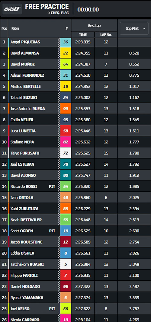 Daniel Holgado (Red Bull GASGAS Tech3) s’est constitué une petite avance de 11 points dans la course aux accessits du classement général, mais avec encore 50 unités en jeu, du moins si le calendrier est maintenu, Collin Veijer (Liqui Moly Husqvarna Intact GP) paraît dans une bonne dynamique, à l’image de sa 3e place obtenue en Thaïlande, en subtilisant le podium au malchanceux Taiyo Furusato (Honda Team Asia) à la sortie du dernier virage.