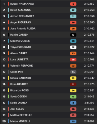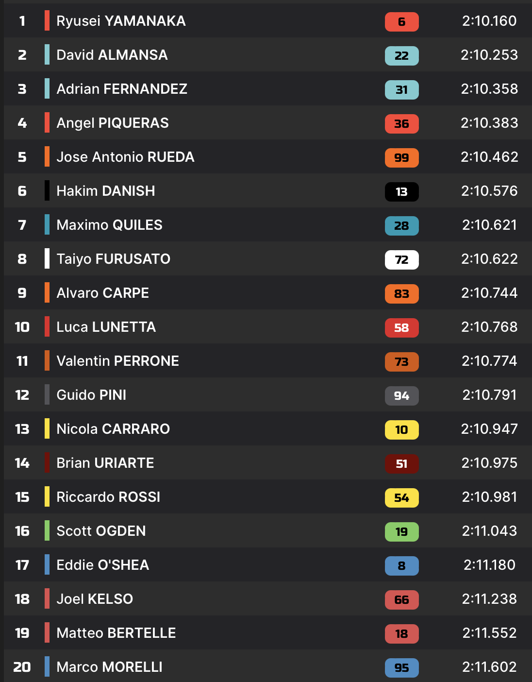 | FP2 | 2’10:102 Adrian Fernandez | 2’10.160 Ryusei Yanamaka |