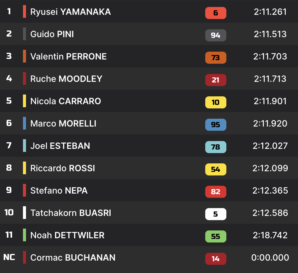 Déjà le plus rapide dans la matinée, Ryusei Yamanaka réitère en Q1. Le Japonais signe un temps en 2:11.261 en fin de séance, après l’avoir globalement dominée. Il termine trois dixièmes devant Guido Pini, cinq Valentin Perrone et Ruche Moodley, qui se qualifient également pour la Q2.