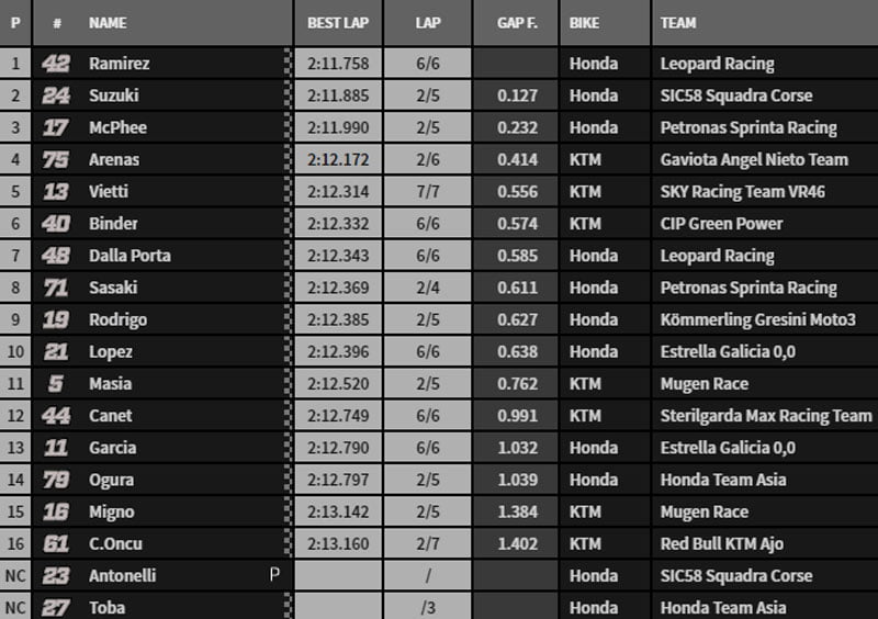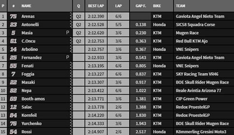 Même chose pour Gabriel Rodrigo qui s’est classé troisième à un peu moins de quatre dixièmes, devant Celestino Vietti qui joue le titre de rookie et le Champion du Monde Lorenzo Dalla Porta. John McPhee et son coéquipier Ayumu Sasaki se voyaient quant à eux crédités des sixième et septième places. Ai Ogura, Arón Canet et Kaito Toba, qui n’aura pas été en mesure de hausser son rythme, complétaient le Top 10 combiné. Se retrouvent également en Q2 : Sergio Garcia, Alonso López, Andrea Migno et Darryn Binder, également sauvé grâce à sa prestation de la veille.