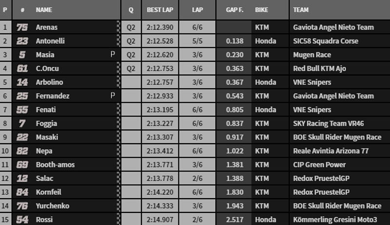 Dans les derniers instants, Arenas prend les commandes en 2’12.390 devant Antonelli sorti de nulle part. Masiá et Öncü suivent pour aller en Q2. Arbolino et Fernández sont déconfits car premiers éliminés. Fenati s’élancera 21e. Les pilotes Snipers sont loin du compte.