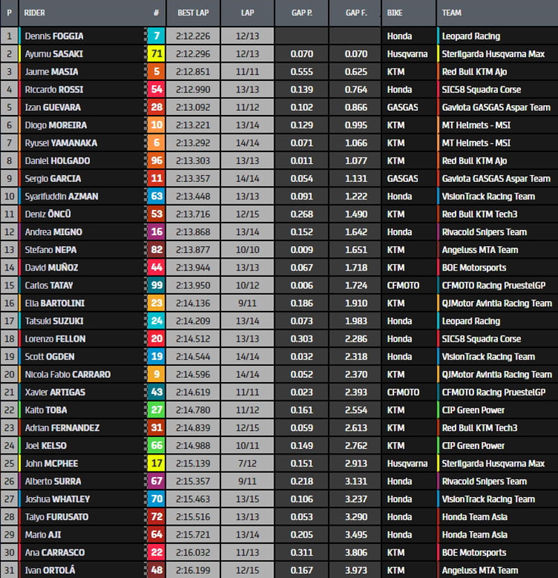 Dans la foulée, Sergio García se porte à la deuxième position mais Dennis Foggia réplique en 2’12.226 devant Ayumu Sasaki et Izan Guevara.