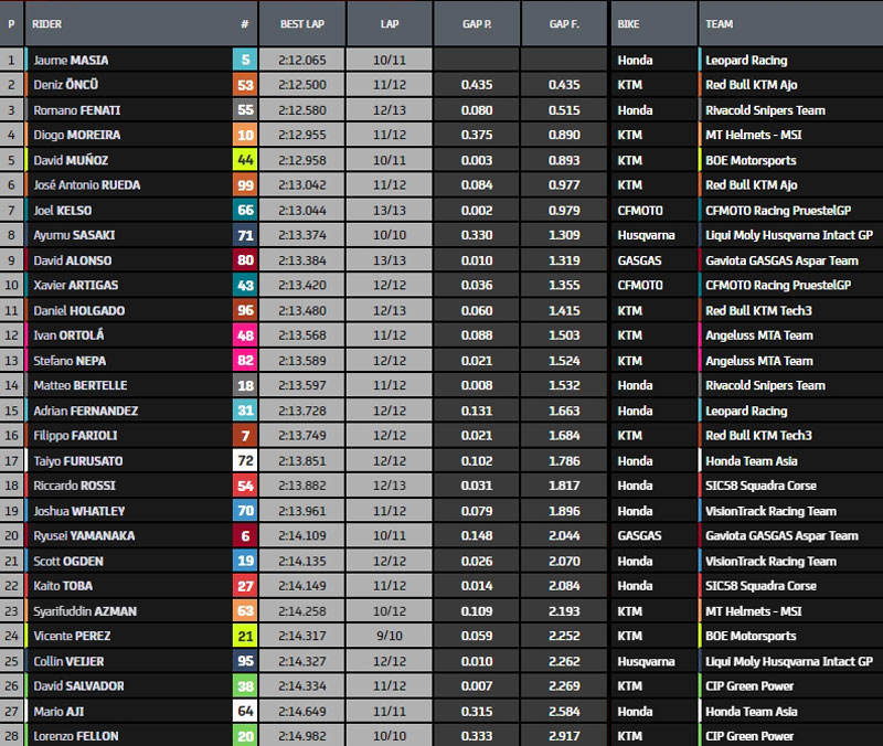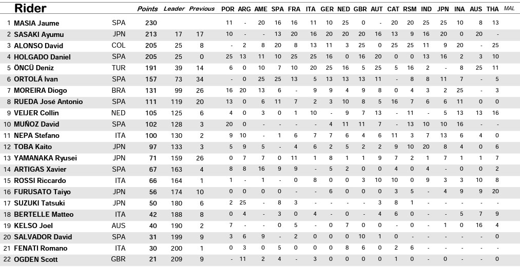 Il reste néanmoins dans la course au titre, tout comme Daniel Holgado (Red Bull KTM Tech3), le rookie colombien David Alonso (Gaviota GasGas Aspar Team) vainqueur en Thaïlande, le maintenant aguerri  Deniz Öncü (Red Bull KTM Ajo) et l’Espagnol Iván Ortolá (KTM Angeluss MTA Team), alors que le vaillant Brésilien Diogo Moreira (MT Helmets – MSI) en a été éliminé à Buriram.