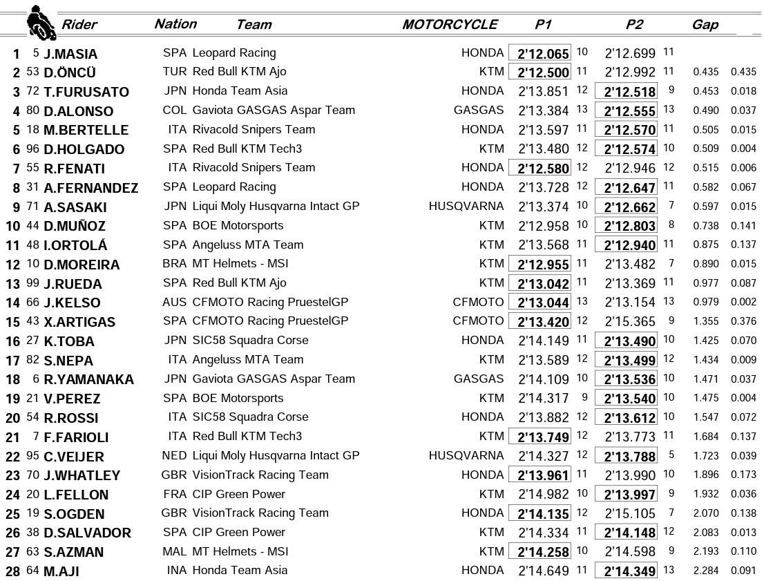 David Alonso inscrit 2’12.818 au passage suivant, puis Ryusei Yamanaka 2’12.628 au troisième tour lancé, concluant ainsi la première moitié de séance: Yamanaka, Alonso, Rueda, Holgado, Rossi, Oncu, Moreira, Ortola, Fernandez, Sasaki et Munoz, personne n’ayant pour le moment mis à mal la référence de Jaume Masia établie hier.