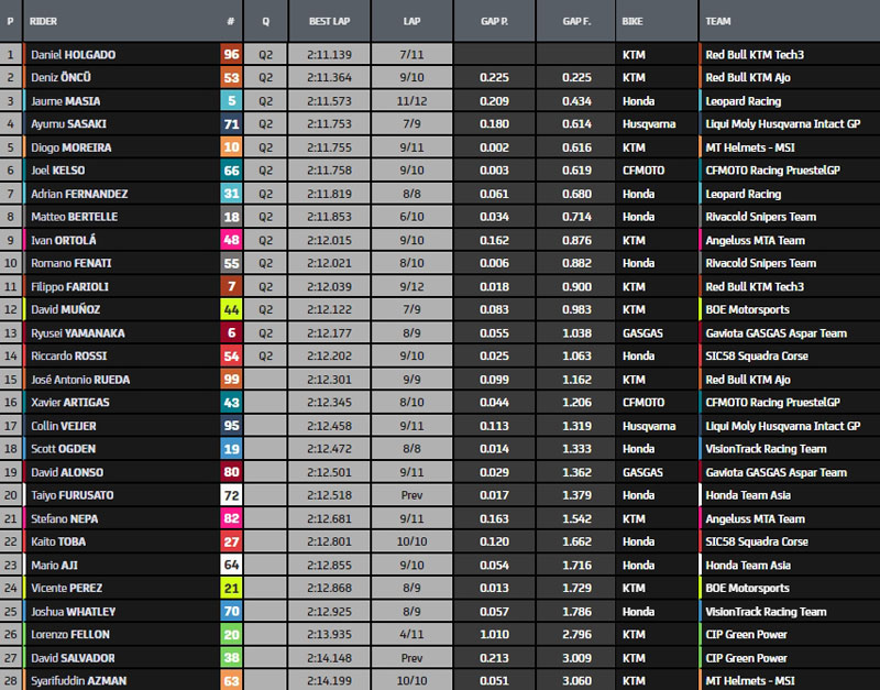 Quoi qu’il en soit, le leader du championnat et Deniz Öncü (Red Bull KTM Ajo), Taiyo Furusato (Honda Team Asia), David Alonso (Gaviota GasGas Aspar Team), Matteo Bertelle (Rivacold Snipers Team), Daniel Holgado (Red Bull KTM Tech3), Romano Fenati (Rivacold Snipers Team), Adrian Fernandez (Leopard Racing), Ayumu Sasaki (Liqui Moly Husqvarna Intact GP), David Muñoz (BOE Motorsports), Iván Ortolá (KTM Angeluss MTA Team), Diogo Moreira (MT Helmets – MSI), José Rueda (Red Bull KTM Ajo), et Joel Kelso (CFMOTO Racing PruestelGP) vont donc maintenant de préserver leur place dans le top 14 pour accéder directement à la Qualification-2, lors de cette session de 30 minutes.