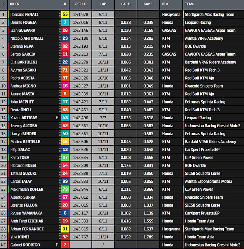 Après que tous les pilotes aient réalisé un passage devant la cellule de chronométrage, c’est Sergio Garcia (GasGas, Aspar Team Moto3, #11) qui mène la danse en 1’43.391, suivi de Dennis Foggia (Honda, Leopard Racing, #7) et Romano Fenati (Husqvarna, Sterilgarda Max Racing Team, #55).
