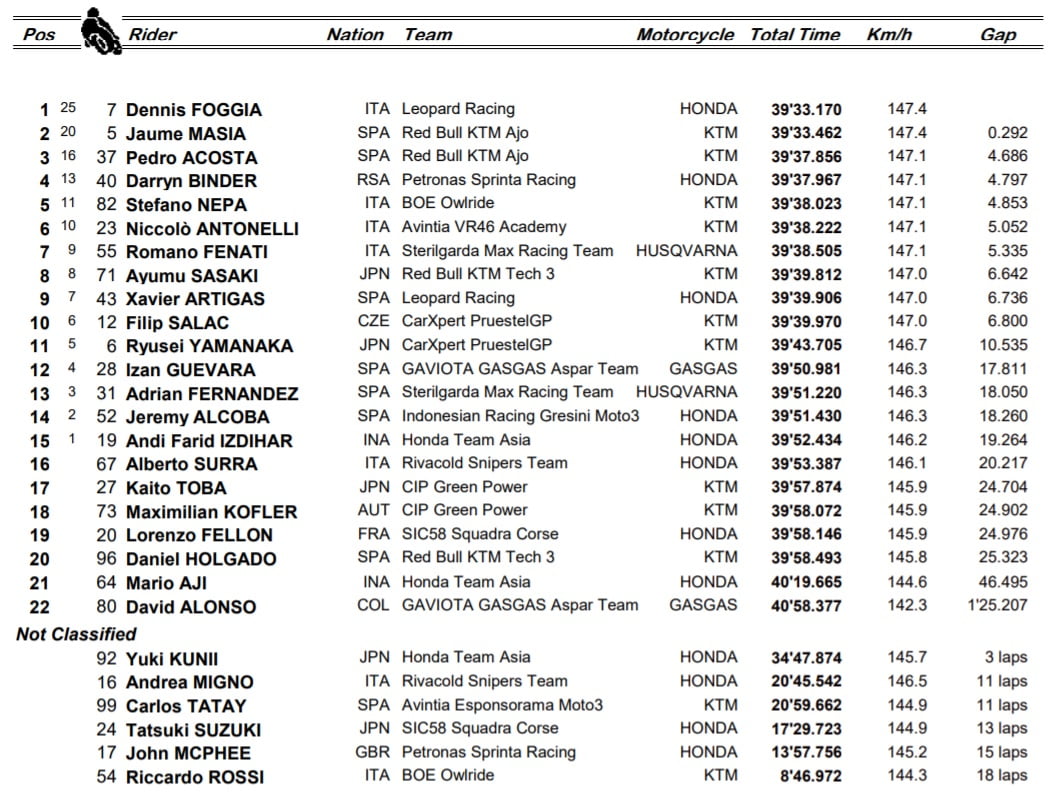 « Je ne suis pas très content, car j’aurais pu remporter cette course, qui au final m’a échappée dans le dernier tour. Mais Dennis Foggia et son équipe ont fait un travail incroyable aujourd’hui, ils ont été très rapides. Nous n’étions pas sûr de la façon dont allait réagir la moto car c’était la première séance disputée sur le sec ce weekend. Mais je suis tout de même heureux d’avoir pu me battre jusqu’au bout et d’avoir su tenir le rythme. Mais peu importe : Je suis prêt à me battre de nouveau sur les deux dernières courses de la saison. »