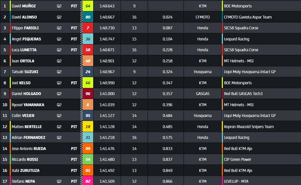 Plus tard, c’est David Munoz (KTM Boé Motorsports) qui s’excite à son tour, avec un 1’40.6. Finalement, personne ne peut le battre dans le dernier tour ! David Alonso est deuxième de la séance, suivi par Filippo Farioli. Quelques uns des favoris ont eu chaud, et José Antonio Rueda (Red Bull KTM Ajo) devra passer par la Q1 !