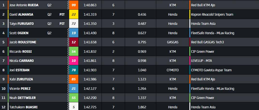 Forcément, tous les yeux sont tournés vers José Antonio Rueda, vainqueur à Aragon, mais piégé ce matin. Il devra se défaire d’un groupe notamment composé du rookie Jacob Roulstone (Red Bull GasGas Tech3) et Taiyo Furusato (Honda Team Asia), habitué à passer de la Q1 à la Q2. C’est parti !