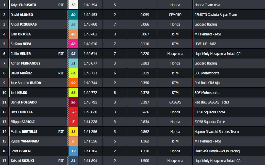 David Alonso s’élancera deuxième, juste devant Angel Piqueras. Ivan Ortola est quatrième, alors que Stefano Nepa (KTM Levelup MTA) complète le top 5. Les autres favoris sont un peu plus loin : Collin Veijer est sixième, en deuxième ligne, José Antonio Rueda 9e, et Daniel Holgado 11e. Les écarts sont très serrés : il n’y a que 67 millièmes entre le premier et le quatrième.