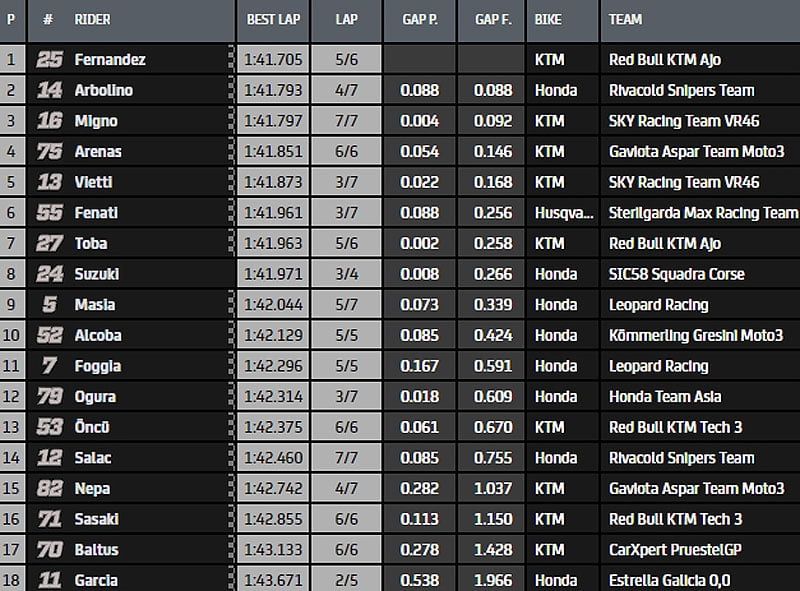 Albert Arenas (KTM, Aspar Team Gaviota), actuel leader du Championnat du Monde, malgré sa chute le WE dernier, s’est hissé en Q2 à la toute fin de la FP3, en pointant sixième. Foggia, Alcoba, Migno et Suzuki complètent le top 10.
