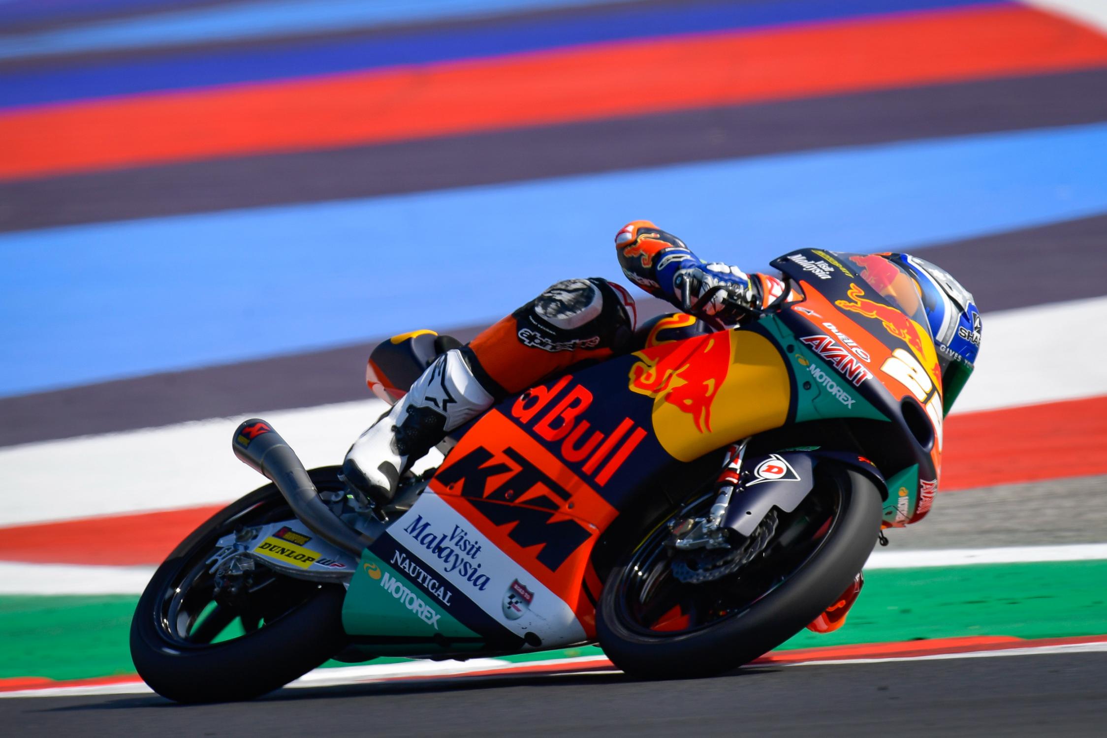 Ce n’était pas le cas pour Tony Arbolino (Honda, Rivacold Snipers Team), dont l’attaque a été stoppée par un drapeau jaune et son meilleur temps été annulé en raison d’un passage sur la ligne dans les 15min au cours desquelles il était censé rester absent. Ce fut aussi une matinée malheureuse pour Gabriel Rodrigo (Honda, Kömmerling Gresini Moto3), qui a chuté par 2 fois et se retrouve en Q1. Quant à John McPhee (Honda, Petronas Sprinta Racing), qui était leader de la FP3 sur le même tracé la semaine dernière, il devra lui aussi passer par la Q1.
