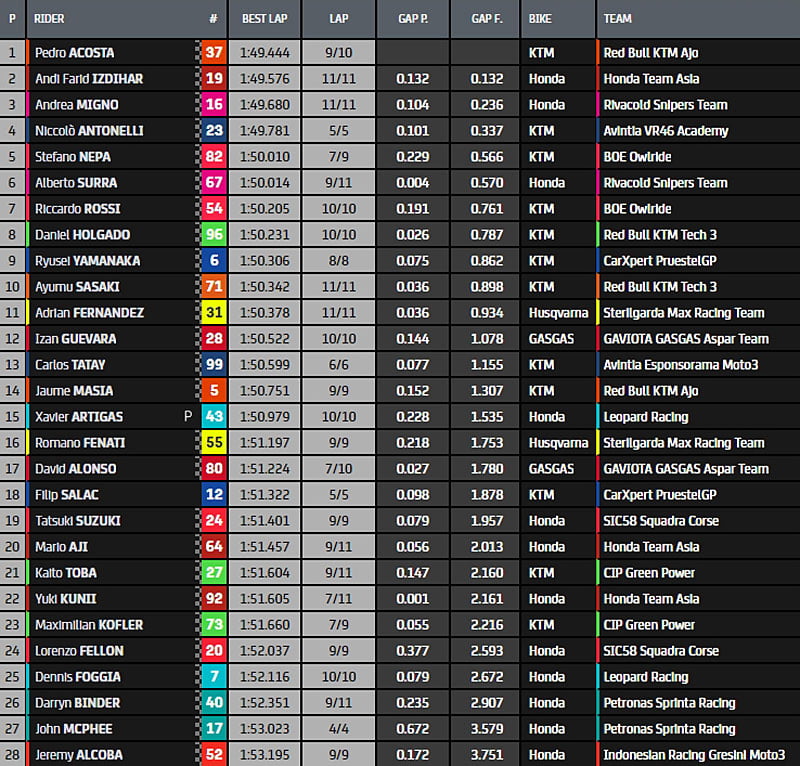 A l’issue de la séance, Stefano Nepa (KTM, BOE Owlride, #82) grille la politesse à Pedro Acosta (KTM, Red Bull KTM Ajo, #37) et passe la ligne en 1’49.429, mais son chrono est annulé. Aussi, Pedro Acosta (KTM, Red Bull KTM Ajo, #37) termine leader, en 1’49.444, devant Andi Farid Izdihar (Honda, Honda Team Asia, #19) et Andrea Migno (Honda, Rivacold Snipers Team, #16). Le poleman Niccolò Antonelli (KTM, Reale Avintia, #23) est 4e.