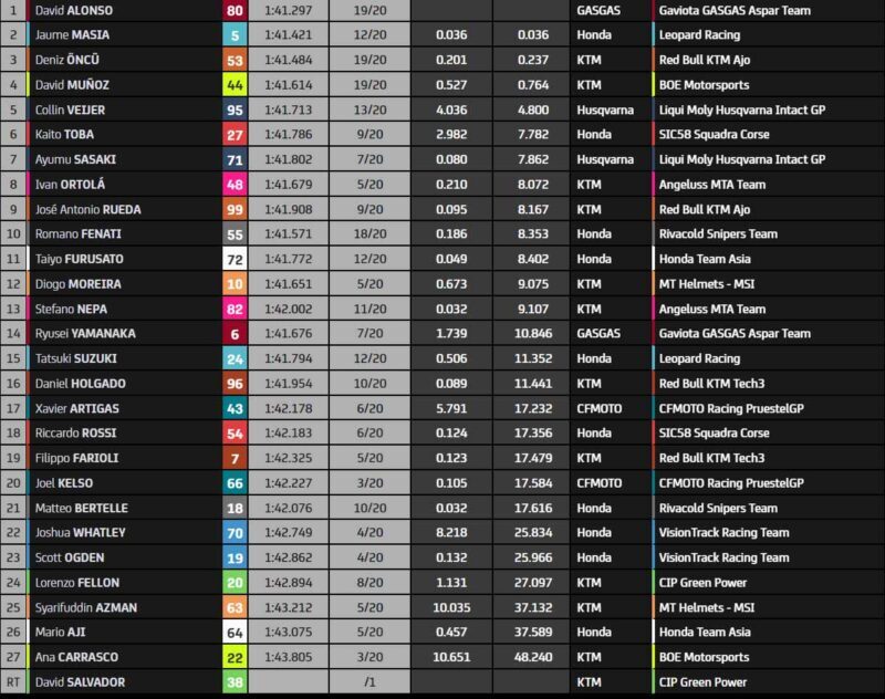 Dans les cassures, Deniz Öncü se décide enfin à passer. David Muñoz et David Alonso en profitent. Daniel Holgado, lui, n’est pas dans un grand jour. Quoi qu’il arrive, il semblerait qu’il va perdre de précieux points avant d’attaquer la tournée outre-mer. Un groupe de quatre pilotes s’est assez largement détaché : Deniz Öncü, en tête, Jaume Masiá, David Muñoz et David Alonso. À sept tours de l’arrivée, tout est encore possible.