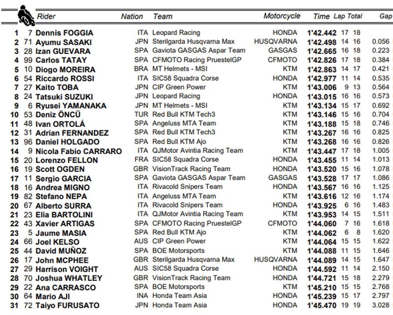 Sous le drapeau à damier, c’est Sasaki qui fait la loi en 1’42.306 devant un Foggia qui pensait avoir fait le plus dur. Mais il récupère la tête du classement après que le chrono du Japonais passe à la trappe suite à un passage dans le vert. Guevara, Tatay et Moreira suivent. Aji chute au virage 15. Fellon est 16è. Garcia seulement 18è.