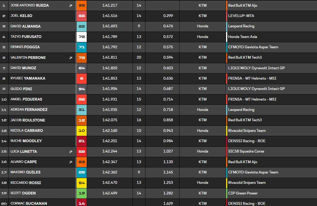 David Almansa connaît aussi une chute, ce qui n’est pas idéal pour une première séance. Dans le même temps, José Antonio Rueda est repassé en tête de cette séance extrêmement calme, il faut le dire. Il termine en tête de la FP1, devant Joel Kelso (KTM Levelup MTA), et David Almansa.