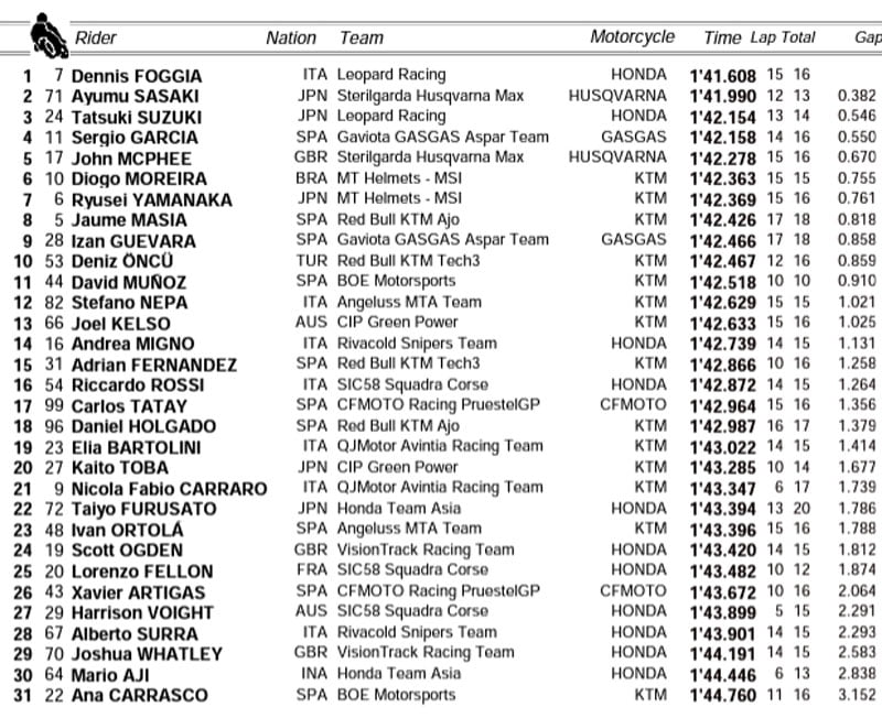 Troisième et quatrième temps pour Izan Guevara (GasGas Aspar) et Carlos Tatay (CFMoto PruestelGP), qui devancent le rookie Diogo Moreira (KTM MT Helmets – MSI), Riccardo Rossi (Honda SIC58 Squadra Corse) et le japonais Kaito Toba (KTM CIP).