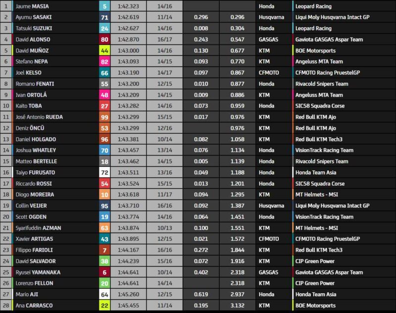 Jaume Masiá termine cette P1 en tête, non sans avoir été inquiété par Ayumu Sasaki, deuxième. Son coéquipier Honda Leopard Racing, Tatsuki Suzuki, est trosième.