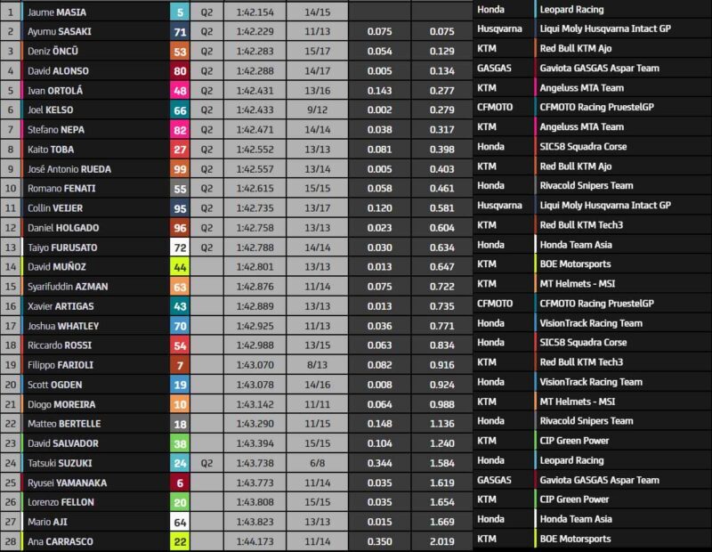 Alors que Jaume Masiá manque de tomber lui aussi, Deniz Öncü en profite pour lui subtiliser le meilleur temps de la séance. En 1’42.540, il est toujours plus lent que ne l’était l’Espagnol ce matin. Ça s’emballe. David Alonso améliore, comme beaucoup d’autres, dont Iván Ortolá (KTM Angeluss MTA Team). Puis, Ayumu Sasaki prend le meilleur temps de la rencontre jusqu’ici, mais Daniel Holgado n’est que 19e pour l’instant, synonyme d’un passage en Q1 !