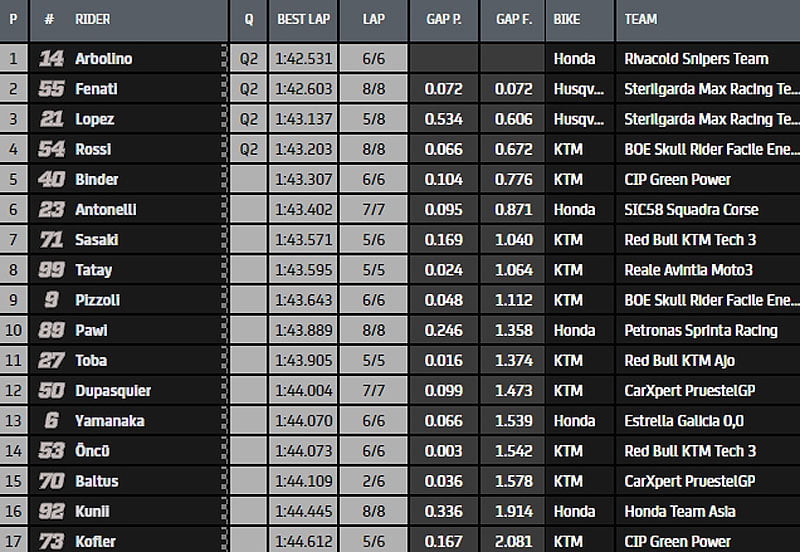 A l’issue de la Q1, et d’un dernier tour très animé, c’est finalement Tony Arbolino (Honda, Rivacold Snipers Team) qui réalise le meilleur temps, en 1’42.511, devant Romano Fenati et son coéquipier Alonso López du Sterilgarda Max Racing Team. Riccardo Rossi (KTM, BOE Skull Rider Facile.Energy) est le quatrième pilote à se hisser en Q2.