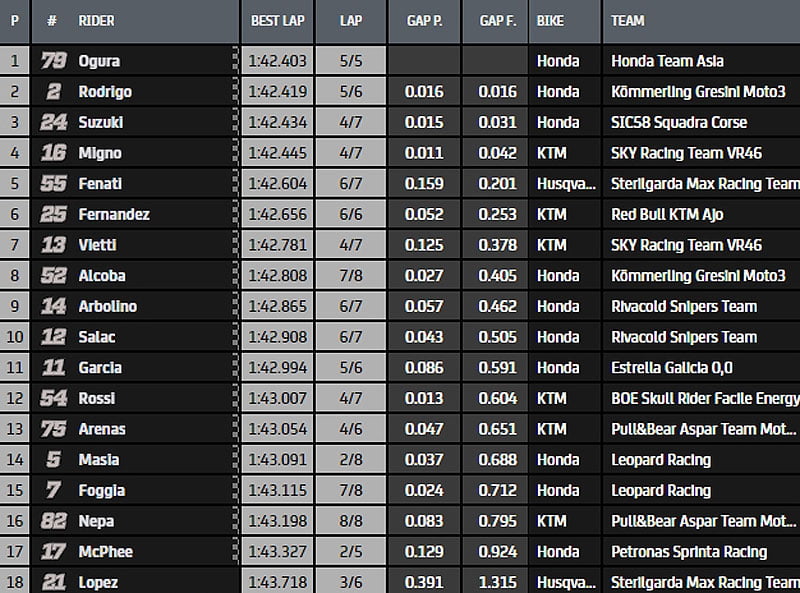 Gabriel Rodrigo (Honda, Kömmerling Gresini Moto3) s’empare du meilleur chrono dans les dernières secondes, mais Ai Ogura (Honda, Honda Team Asia) réalise un dernier secteur d’anthologie et réalise la première pole position de sa carrière en Moto3.