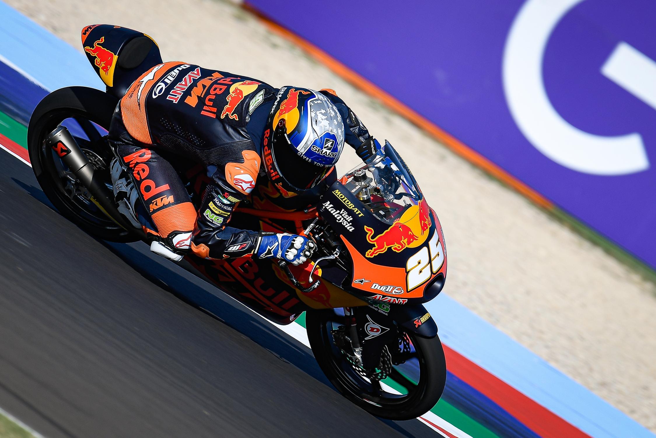 Albert Arenas (KTM, Aspar Team Gaviota) a commis des erreurs en fin de séance qui l’ont vu glisser jusqu’à la 13e place et entamera la défense de sa première place au championnat à partir de la cinquième ligne et aux côtés de Jaume Masià (Honda, Leopard Racing) et Dennis Foggia (Honda, Leopard Racing). Cependant, l’un de ses principaux challengers, John McPhee (Honda, Petronas Sprinta Racing), a connu un après-midi difficile à Misano, victime d’une chute au virage quatre dans la première moitié de Q2, et a eu du mal à faire mieux que 17e sur la grille.