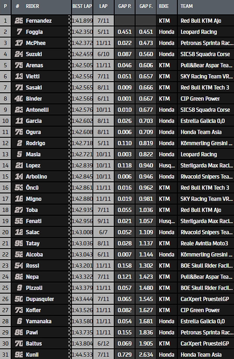 A la fin de cette séance de Warm-Up très calme, où aucune chute n’est à comptabiliser, c’est Raúl Fernández (KTM, Red Bull KTM Ajo) qui mène la danse devant Dennis Foggia (Honda, Leopard Racing) et John McPhee (Honda, Petronas Sprinta Racing) qui se rassure après sa chute en qualifications et sa 17e position sur la grille.
