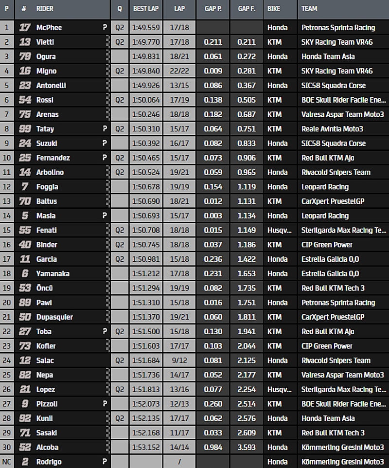 Sergio Garcia (Honda, Estrella Galicia 0,0), qui s’était classé 14e lors de la FP1, héritait pour sa part du deuxième chrono devant Romano Fenati (Husqvarna, Sterilgarda Max Racing Team) et Raúl Fernández (KTM, Red Bull KTM Ajo), qui gagnaient quant à eux pas moins de 26 et 13 positions.