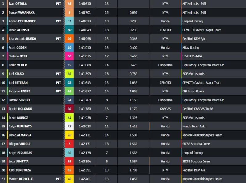 David Alonso est troisième, juste derrière Ryusei Yamanaka. Le Colombien n’est pas aussi à l’aise ici qu’ailleurs mais reste rapide. Attention à l’élimination pour Daniel Holgado, 13e, et déjà en difficulté ici l’an passé. José Antonio Rueda (Red Bull KTM Ajo) complète le top 5.