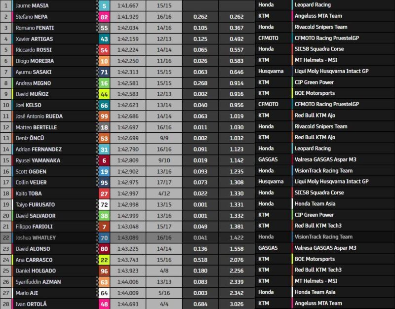 Finalement, c’est Jaume Masiá qui finit en tête après avoir réalisé le meilleur temps dans le dernier tour. Stefano Nepa est deuxième, et Romano Fenati (Honda Snipers Team) termine troisième, après un bel effort en fin de séance.