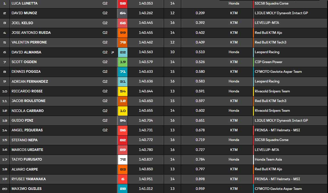 Dans les dernières minutes, les pilotes s’emballent. David Almansa, le leader, part à la faute. Quelqu’un pourra-t-il le détrôner ? Oui ! José Antonio Rueda améliore la meilleure marque. Mais Luca Lunetta (Honda Sic58 Squadra Corse) réalise un tour absolument énorme, un peu moins d’une demi-seconde plus rapide. Il conclut cette séance en tête, alors que Maximo Quiles devra passer par la Q1. Idem pour Alvaro Carpe, quelle surprise ! David Munoz termine deuxième, devant Joel Kelso et Rueda. Il ne faudra absolument pas manquer cette séance de qualifications !
