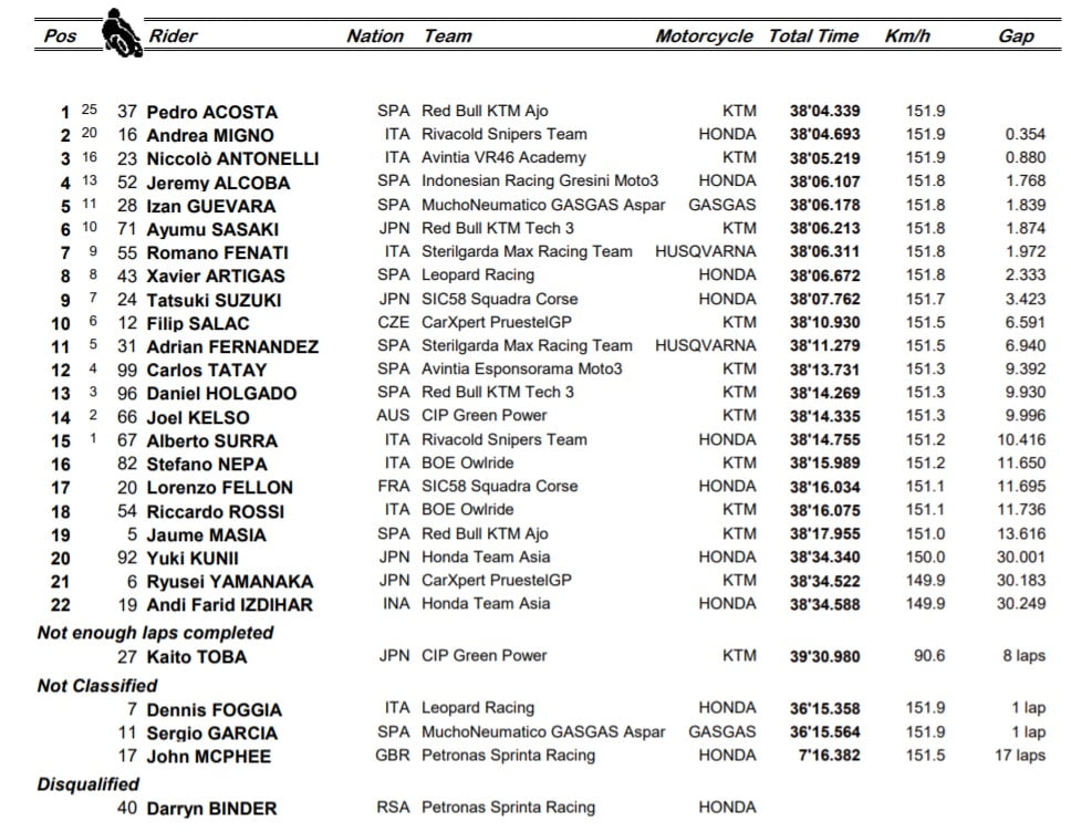 « Tout d’abord je tiens à adresser mes félicitations à Pedro Acosta pour son titre, mais je suis tout de même désolé pour Dennis Foggia qui a perdu le championnat en raison d’une chute qui n’est pas du tout de sa faute. En ce qui concerne ma course je suis vraiment très content, car je suis parti depuis la 15e place. Durant tout le weekend je n’ai pas été exceptionnellement rapide, car j’ai rencontré pas mal de problèmes au niveau du grip. Mais aujourd’hui les conditions ont été plus chaudes et cela a été plus facile pour moi en course. »