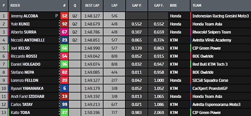 | Q1 | 1’48.845 Romano Fenati | 1’48.127 Jeremy Alcoba |