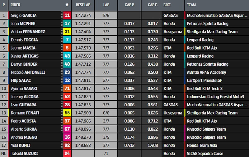Finish qui voit Garcia prendre le leadership en 1.47.274s devant McPhee, Fernandez, Foggia, Masia, Artigas, Binder, Antonelli, Salac et Sasaki.