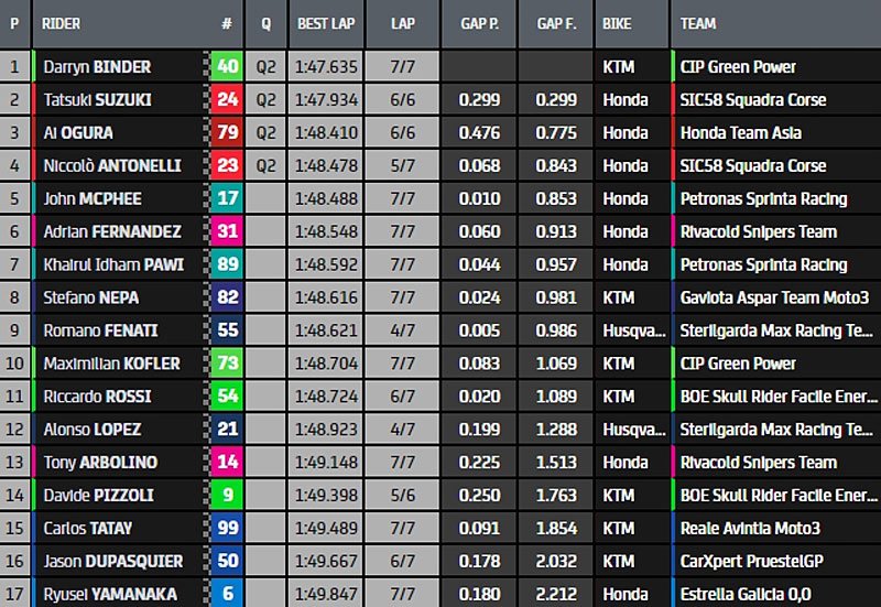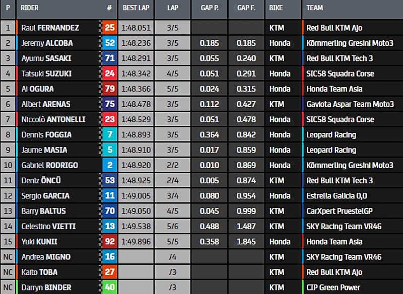 Fernandez décroche la pole provisoire en 1.48.051s devant Alcoba, Sasaki, Arenas et Antonelli. Ogura n’est pas encore sorti..