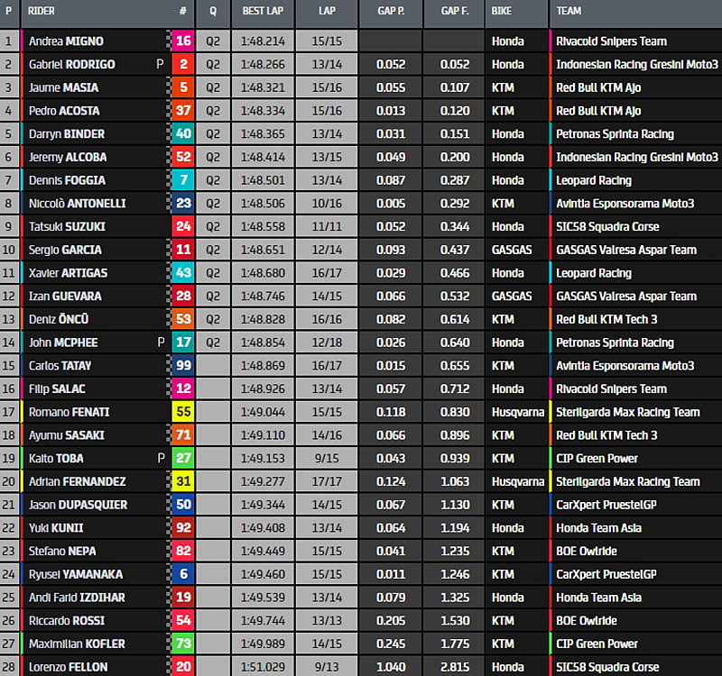 On est à mi-séance, Tatsuki Suzuki (Honda, SIC58 Squadra Corse, #24) passe en tête, en 1’49.012. Il relègue Niccolò Antonelli (KTM, Reale Avintia, #23) à la seconde place, suivi d’Andrea Migno (Honda, Rivacold Snipers Team, #16). Pedro Acosta (KTM, Red Bull KTM Ajo, #37) n’est pour le moment plus en Q2, lui qui a gagné la dernière course et mène le Championnat!