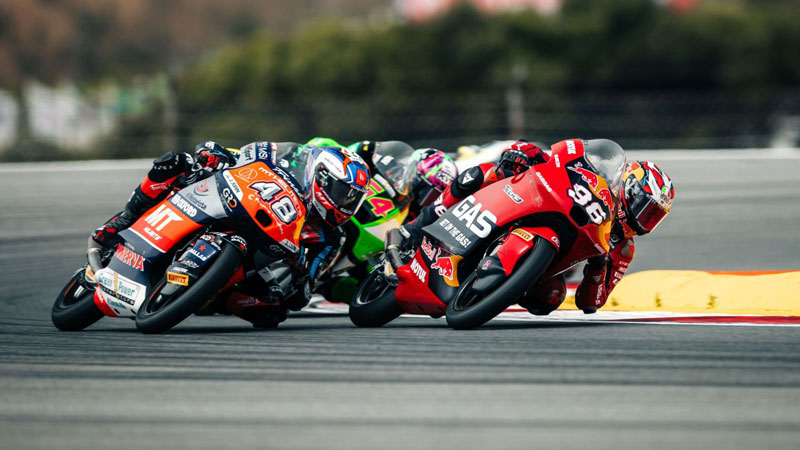 A l’extinction des feux, les premiers virages sont animés, mais Daniel Holgado parvient à s’installer dans le groupe de tête, derrière Rueda qui a pris un excellent départ. C’est le début de nombreux dépassements et changements de positions entre eux, même si Rueda parvient à se maintenir en tête pendant dix tours, avant que David Alonso ne prenne le relais. À huit tours de l’arrivée, Dani est troisième à un peu moins de 0,5 seconde de la tête, avec Rueda dans sa roue arrière, qui ne veut pas le laisser partir. Le pilote Red Bull KTM Ajo continue de mettre la pression sur le pilote Red Bull GASGAS Tech3, réussit à se rapprocher de Holgado, mais le numéro 96 revient rapidement à sa deuxième place. Pendant ce temps, le groupe de chasse Ortola-Veijer-Kelso revenait, avec un écart de 0.633 sur le troisième. Au tour suivant, Holgado dépasse Alonso dans la grande ligne droite et prend la tête d’un GP du Portugal intense.