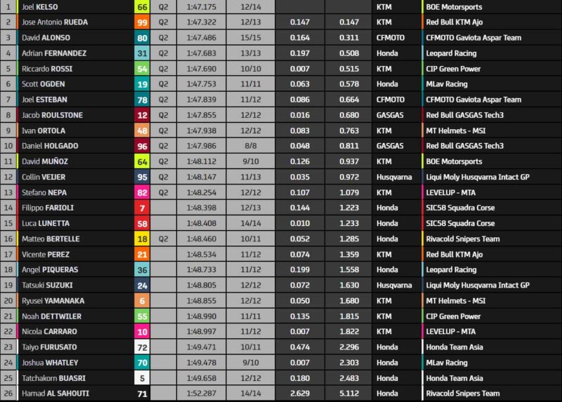 Plus qu’un tour à disputer. Mais personne ne semble en mesure d’améliorer ! Joel Kelso termine cette session en première position. Daniel Holgado parvient, au bout du suspense, à réaliser un tour qui l’envoie directement en Q2. C’est aussi le cas du rookie Joel Esteban (CFMoto Aspar Team), mais aussi, pour Scott Ogden (Honda MLav Racing). Collin Veijer se sauve également, à l’instar du rookie Jacob Roulstone (Red Bull GasGas Tech3).