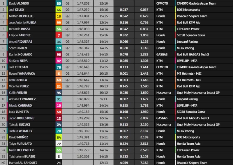 Mais attention à Joel Kelso (KTM Boé Motorsports) ! Souvent bien placé, il réussit à mettre bout à bout un excellent tour, lui aussi classé deuxième, mais à moins d’un dixième de seconde d’Alonso. Matteo Bertelle (Honda Snipers Team) fait un beau troisième, dans les tous derniers instants. Collin Veijer (Liqui Moly Husqvarna Intact GP) est quant à lui mal en point, pas qualifié dans les 14 directement envoyés en Q2. La P2 promet, alors rendez-vous demain matin pour plus d’action en Moto3.